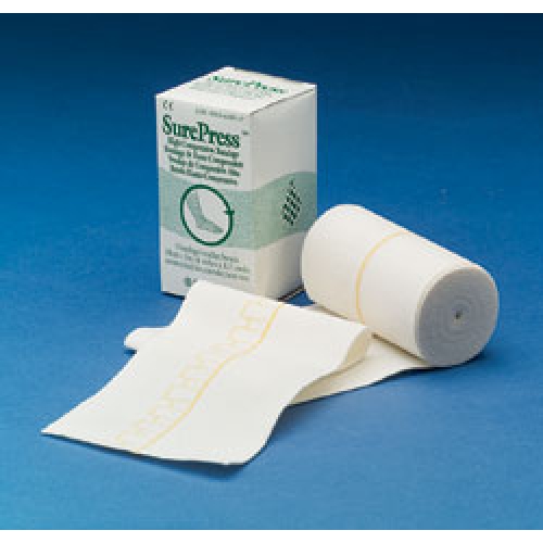 SurePress® High Compression Bandage is an elastic wrap that provides sustained graduated compression in an easy to use format. This reusable bandage has a yellow center line and two rectangular extension indicators for easier application and appropriate amount of compression for a variety of leg sizes. It is indicated for the management of venous leg ulcers and associated conditions. It can be used alone or in combination with SurePress® Absorbent Padding.